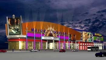 Modern multi-storey Cineplex Theatre with Fast Food restaurants, 10 pin bowling lanes car parking for 474 vehicles etc.